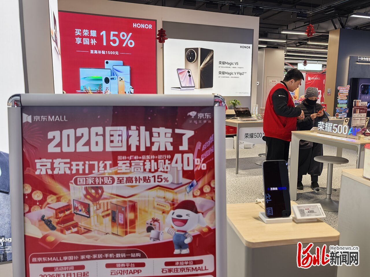 这股消费热浪,在市场一线时,走进京东MALL石家庄新华店,“2026国补来了”的宣传语随处可见,消费品以旧换新的营销氛围拉满。